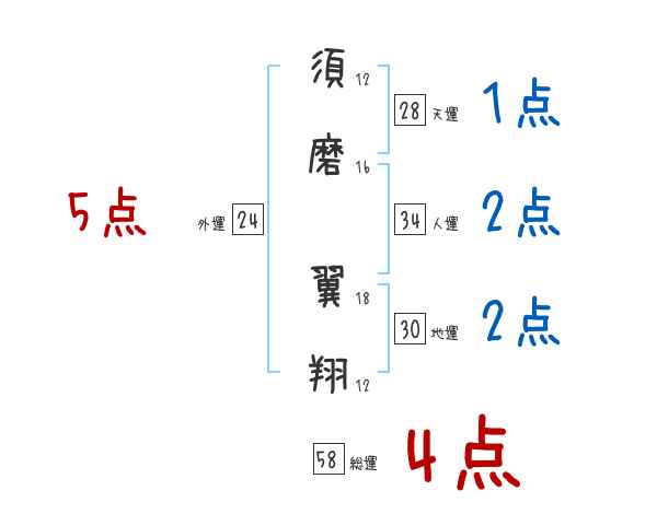 総運![]() | 須磨翼翔さんの総運は58画の4つ星!安定した生活。大器晩成タイプ。 あなたの人生を表す1番重要な運勢です。生涯を通じて影響する総合運となり、主に50歳以降の晩年期に影響を及ぼします。 |