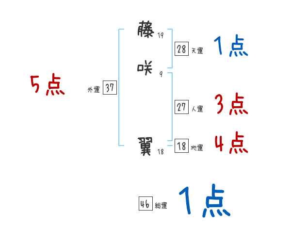 天運![]() | 藤咲翼さんの天運は28画の1つ星!家庭環境に注意。スポーツで活躍できる能力があるかも。 家系が持つ宿命的な運勢を表します。祖先から受け継いだ苗字ですので自分の力が及びません。家柄を象徴します。 |