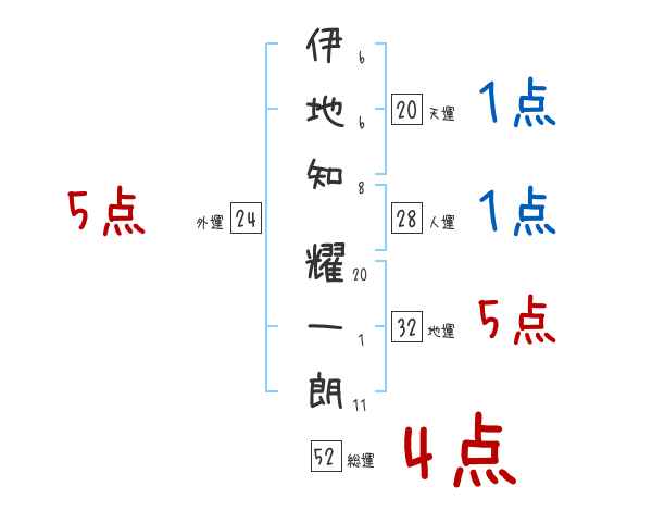 総運![]() | 伊地知耀一朗さんの総運は52画の4つ星!先見性と独創性に優れ考える力がある。強運の持ち主。 あなたの人生を表す1番重要な運勢です。生涯を通じて影響する総合運となり、主に50歳以降の晩年期に影響を及ぼします。 |