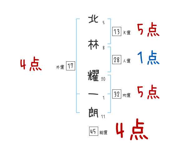 天運![]() | 北林耀一朗さんの天運は13画の5つ星!才能に恵まれ人気がある。名声を手に入れる。円満な人生。 家系が持つ宿命的な運勢を表します。祖先から受け継いだ苗字ですので自分の力が及びません。家柄を象徴します。 |