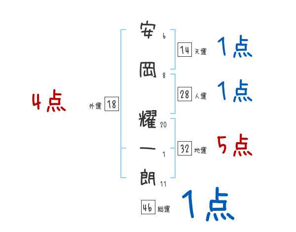 外運![]() | 安岡耀一朗さんの外運は18画の4つ星!情熱的で剛気。忍耐力があり信頼される。 生活面を象徴する運勢です。外部から受ける影響力を表し、結婚運、家庭運や職場、環境への順応性を表します。 |