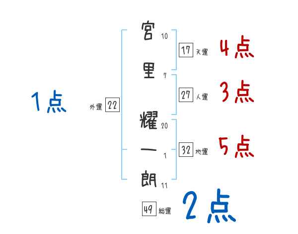地運![]() | 宮里耀一朗さんの地運は32画の5つ星!柔軟性があり成功する。チャンスが多く金運が良い。 個性を表す基礎的な運勢です。性格形成や対人関係、行動力など家庭環境に影響されます。主に誕生してから20歳くらいまでの若年期の運勢を表します。 |