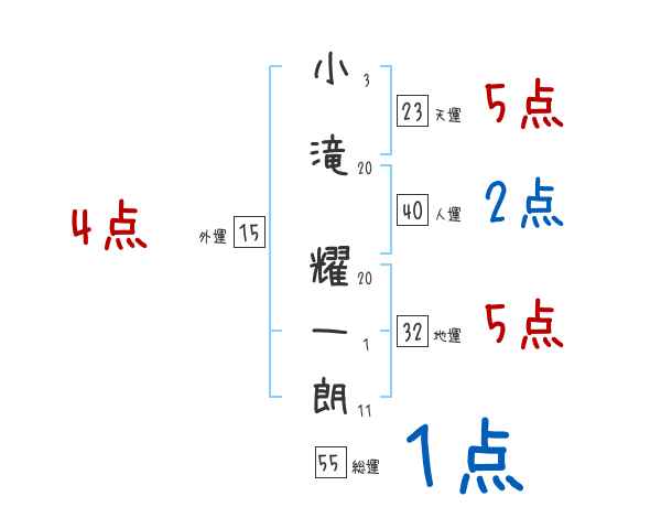 天運![]() | 小滝耀一朗さんの天運は23画の5つ星!想像力に優れ活力がある。一代で成功し名誉を手に入れる。 家系が持つ宿命的な運勢を表します。祖先から受け継いだ苗字ですので自分の力が及びません。家柄を象徴します。 |