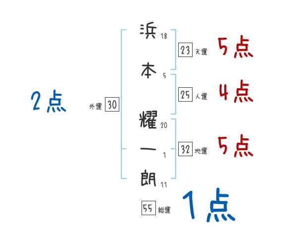 地運![]() | 浜本耀一朗さんの地運は32画の5つ星!柔軟性があり成功する。チャンスが多く金運が良い。 個性を表す基礎的な運勢です。性格形成や対人関係、行動力など家庭環境に影響されます。主に誕生してから20歳くらいまでの若年期の運勢を表します。 |
