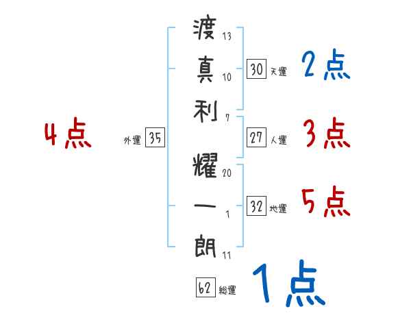 地運![]() | 渡真利耀一朗さんの地運は32画の5つ星!柔軟性があり成功する。チャンスが多く金運が良い。 個性を表す基礎的な運勢です。性格形成や対人関係、行動力など家庭環境に影響されます。主に誕生してから20歳くらいまでの若年期の運勢を表します。 |