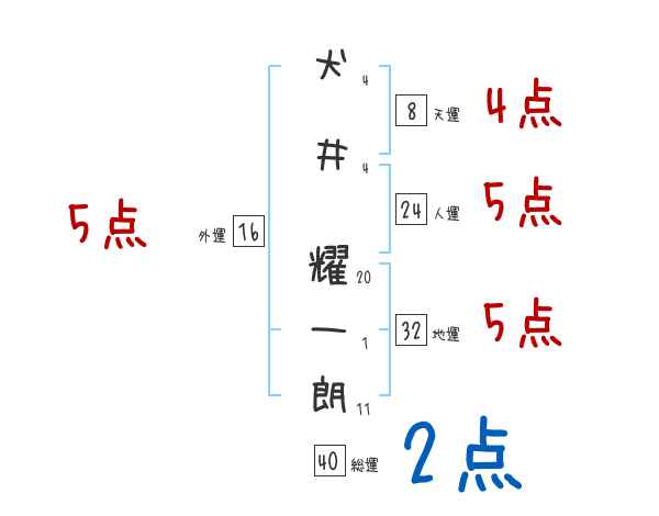人運![]() | 犬井耀一朗さんの人運は24画の5つ星!家庭運が良く順調な人生。金運にも恵まれる。 性格や才能などを表す2番目に重要な運勢です。人間関係や協調性、社会的な成功に影響します。主に20歳から50歳ぐらいまでの中年期の運勢を表します。 |