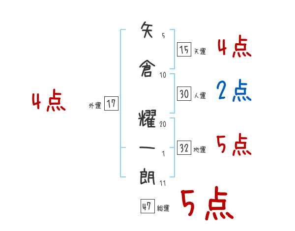 総運![]() | 矢倉耀一朗さんの総運は47画の5つ星!実力が開花し発展する円満な人生。財に恵まれる。 あなたの人生を表す1番重要な運勢です。生涯を通じて影響する総合運となり、主に50歳以降の晩年期に影響を及ぼします。 |