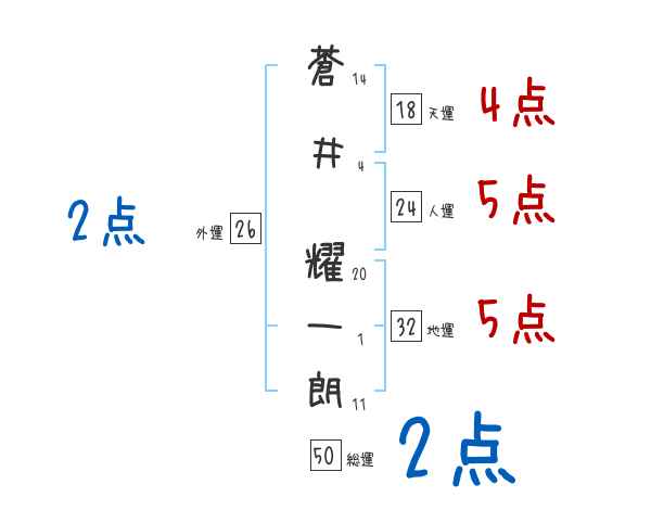 人運![]() | 蒼井耀一朗さんの人運は24画の5つ星!家庭運が良く順調な人生。金運にも恵まれる。 性格や才能などを表す2番目に重要な運勢です。人間関係や協調性、社会的な成功に影響します。主に20歳から50歳ぐらいまでの中年期の運勢を表します。 |