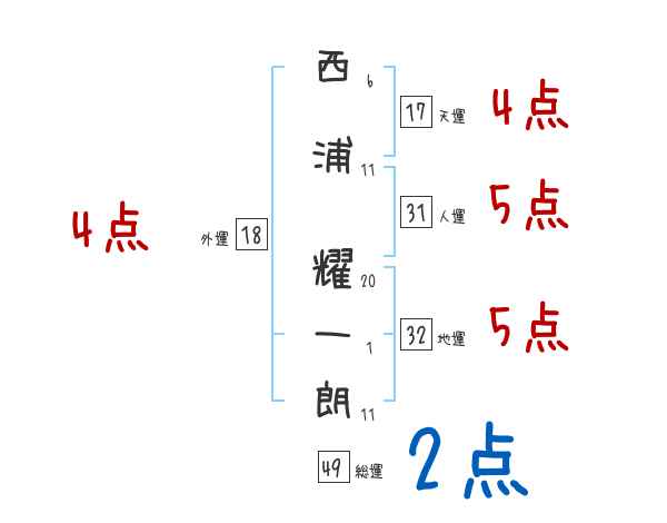 天運![]() | 西浦耀一朗さんの天運は17画の4つ星!積極的な行動力。地位を気づき財産を手に入れる。純粋な心と直感力。 家系が持つ宿命的な運勢を表します。祖先から受け継いだ苗字ですので自分の力が及びません。家柄を象徴します。 |