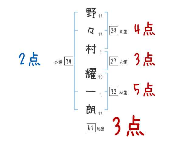 外運![]() | 野々村耀一朗さんの外運は34画の2つ星!独創性に優れるが、自尊心が強く災難に注意しましょう。 生活面を象徴する運勢です。外部から受ける影響力を表し、結婚運、家庭運や職場、環境への順応性を表します。 |