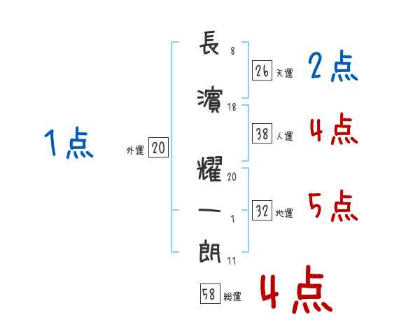 総運![]() | 長濵耀一朗さんの総運は58画の4つ星!安定した生活。大器晩成タイプ。 あなたの人生を表す1番重要な運勢です。生涯を通じて影響する総合運となり、主に50歳以降の晩年期に影響を及ぼします。 |