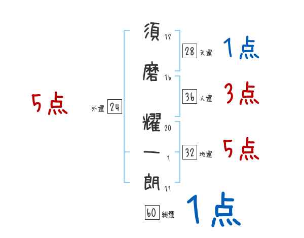 天運![]() | 須磨耀一朗さんの天運は28画の1つ星!家庭環境に注意。スポーツで活躍できる能力があるかも。 家系が持つ宿命的な運勢を表します。祖先から受け継いだ苗字ですので自分の力が及びません。家柄を象徴します。 |
