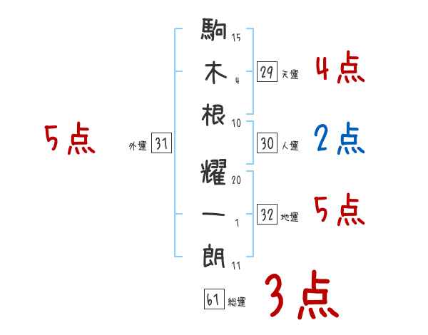 外運![]() | 駒木根耀一朗さんの外運は31画の5つ星!社交性があり判断力に優れる。順風満帆な人生で円満な生活。 生活面を象徴する運勢です。外部から受ける影響力を表し、結婚運、家庭運や職場、環境への順応性を表します。 |