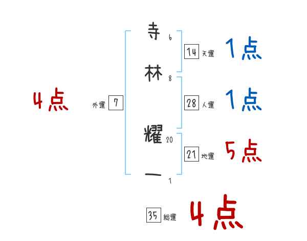 総運![]() | 寺林耀一さんの総運は35画の4つ星!温厚な性格で感受性が高い。穏和な性格で人望が厚い。 あなたの人生を表す1番重要な運勢です。生涯を通じて影響する総合運となり、主に50歳以降の晩年期に影響を及ぼします。 |