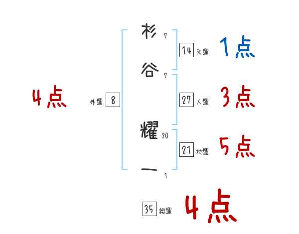 総運![]() | 杉谷耀一さんの総運は35画の4つ星!温厚な性格で感受性が高い。穏和な性格で人望が厚い。 あなたの人生を表す1番重要な運勢です。生涯を通じて影響する総合運となり、主に50歳以降の晩年期に影響を及ぼします。 |