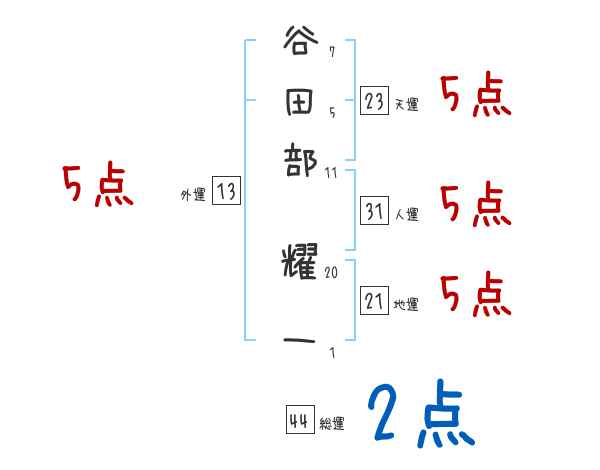 総運![]() | 谷田部耀一さんの総運は44画の2つ星!誠実で慎重な性格。物事を考えすぎないように注意しましょう。 あなたの人生を表す1番重要な運勢です。生涯を通じて影響する総合運となり、主に50歳以降の晩年期に影響を及ぼします。 |