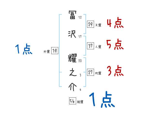 外運![]() | 冨沢耀之介さんの外運は19画の1つ星!優れた才能を持ちますが、協調性が足りないことも。周りの人と協力する事を意識しましょう。 生活面を象徴する運勢です。外部から受ける影響力を表し、結婚運、家庭運や職場、環境への順応性を表します。 |