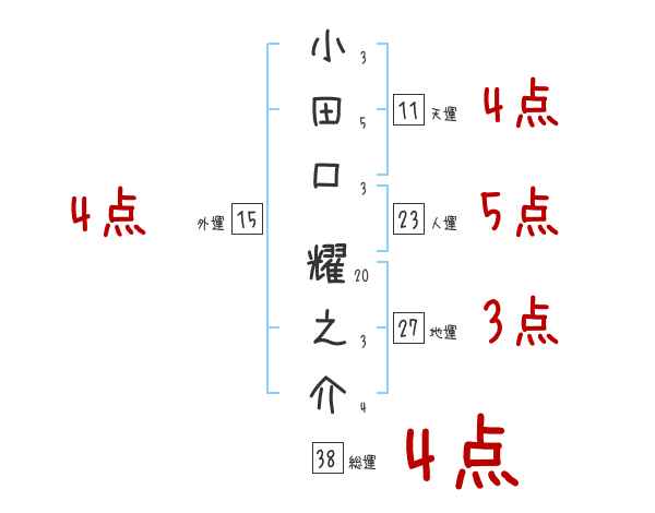 天運![]() | 小田口耀之介さんの天運は11画の4つ星!着実に富や地位を得る幸運な人生。 家系が持つ宿命的な運勢を表します。祖先から受け継いだ苗字ですので自分の力が及びません。家柄を象徴します。 |