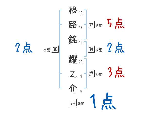 外運![]() | 根路銘耀之介さんの外運は30画の2つ星!浮き沈みの激しさに注意しましょう。 生活面を象徴する運勢です。外部から受ける影響力を表し、結婚運、家庭運や職場、環境への順応性を表します。 |