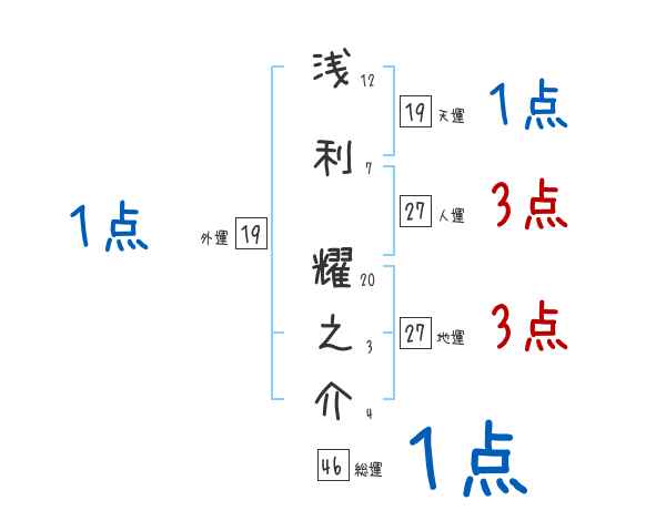 外運![]() | 浅利耀之介さんの外運は19画の1つ星!優れた才能を持ちますが、協調性が足りないことも。周りの人と協力する事を意識しましょう。 生活面を象徴する運勢です。外部から受ける影響力を表し、結婚運、家庭運や職場、環境への順応性を表します。 |
