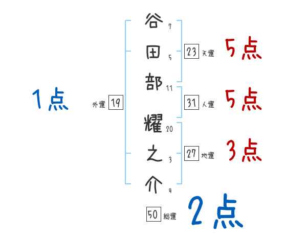 天運![]() | 谷田部耀之介さんの天運は23画の5つ星!想像力に優れ活力がある。一代で成功し名誉を手に入れる。 家系が持つ宿命的な運勢を表します。祖先から受け継いだ苗字ですので自分の力が及びません。家柄を象徴します。 |