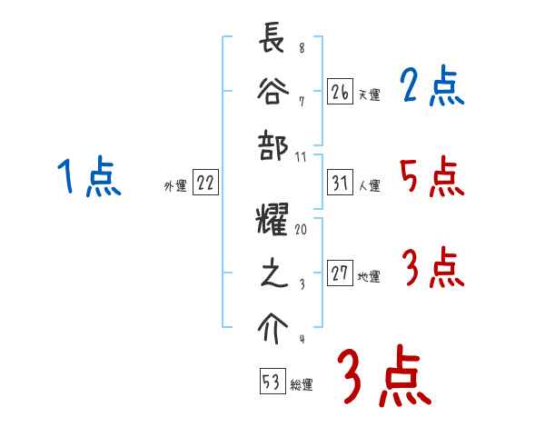 天運![]() | 長谷部耀之介さんの天運は26画の2つ星!波瀾万丈かも。信頼できる人を大事にしましょう。 家系が持つ宿命的な運勢を表します。祖先から受け継いだ苗字ですので自分の力が及びません。家柄を象徴します。 |