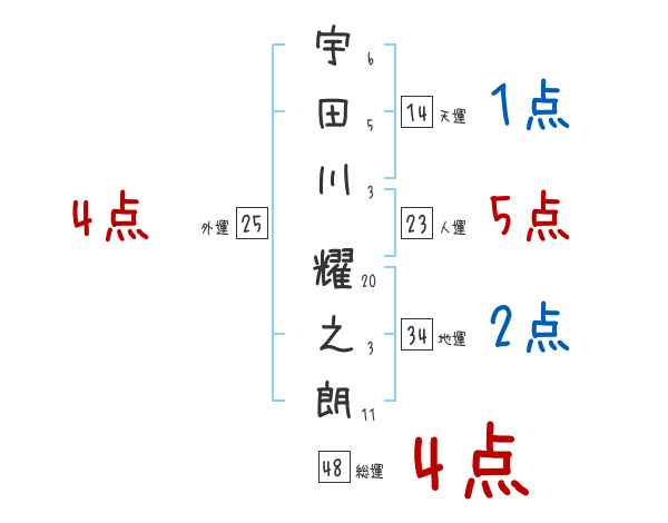 総運![]() | 宇田川耀之朗さんの総運は48画の4つ星!賢明な性格で人望が厚い。指導力があり多くの人に尊敬される。 あなたの人生を表す1番重要な運勢です。生涯を通じて影響する総合運となり、主に50歳以降の晩年期に影響を及ぼします。 |