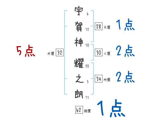 外運![]() | 宇賀神耀之朗さんの外運は32画の5つ星!柔軟性があり成功する。チャンスが多く金運が良い。 生活面を象徴する運勢です。外部から受ける影響力を表し、結婚運、家庭運や職場、環境への順応性を表します。 |
