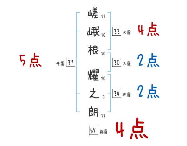 嵯峨根耀之朗さんの外運は37画の5つ星