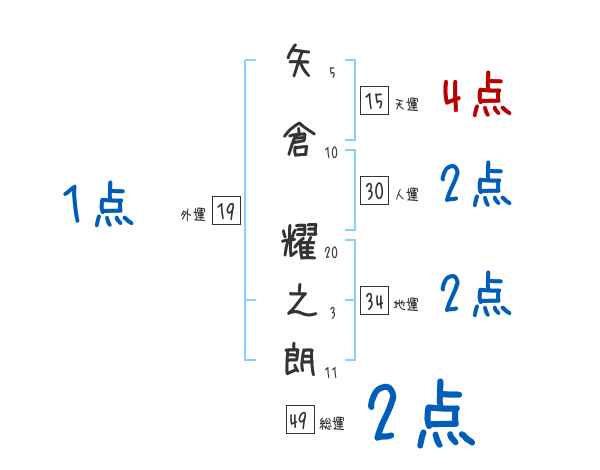 外運![]() | 矢倉耀之朗さんの外運は19画の1つ星!優れた才能を持ちますが、協調性が足りないことも。周りの人と協力する事を意識しましょう。 生活面を象徴する運勢です。外部から受ける影響力を表し、結婚運、家庭運や職場、環境への順応性を表します。 |