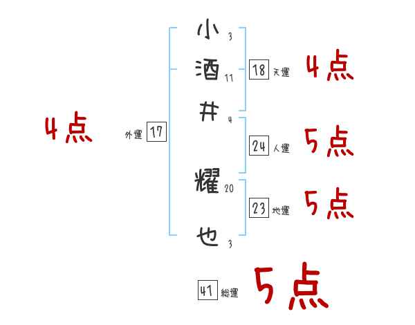 外運![]() | 小酒井耀也さんの外運は17画の4つ星!積極的な行動力。地位を気づき財産を手に入れる。純粋な心と直感力。 生活面を象徴する運勢です。外部から受ける影響力を表し、結婚運、家庭運や職場、環境への順応性を表します。 |