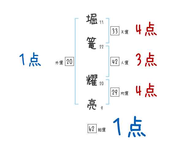 天運![]() | 堀篭耀亮さんの天運は33画の4つ星!権力志向でプライドが高い。勇気があり運を切り開き成功する。 家系が持つ宿命的な運勢を表します。祖先から受け継いだ苗字ですので自分の力が及びません。家柄を象徴します。 |