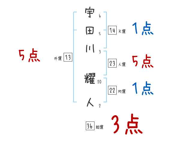 人運![]() | 宇田川耀人さんの人運は23画の5つ星!想像力に優れ活力がある。一代で成功し名誉を手に入れる。 性格や才能などを表す2番目に重要な運勢です。人間関係や協調性、社会的な成功に影響します。主に20歳から50歳ぐらいまでの中年期の運勢を表します。 |