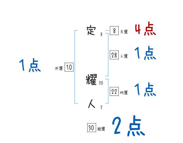 人運![]() | 定耀人さんの人運は28画の1つ星!家庭環境に注意。スポーツで活躍できる能力があるかも。 性格や才能などを表す2番目に重要な運勢です。人間関係や協調性、社会的な成功に影響します。主に20歳から50歳ぐらいまでの中年期の運勢を表します。 |