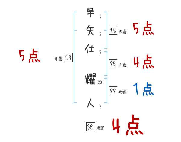 天運![]() | 早矢仕耀人さんの天運は16画の5つ星!人望が厚く大きく発展する。逆転成功が見える。 家系が持つ宿命的な運勢を表します。祖先から受け継いだ苗字ですので自分の力が及びません。家柄を象徴します。 |