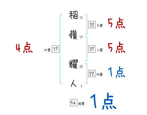 天運![]() | 稲嶺耀人さんの天運は32画の5つ星!柔軟性があり成功する。チャンスが多く金運が良い。 家系が持つ宿命的な運勢を表します。祖先から受け継いだ苗字ですので自分の力が及びません。家柄を象徴します。 |