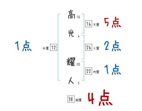 天運![]() | 高光耀人さんの天運は16画の5つ星!人望が厚く大きく発展する。逆転成功が見える。 家系が持つ宿命的な運勢を表します。祖先から受け継いだ苗字ですので自分の力が及びません。家柄を象徴します。 |