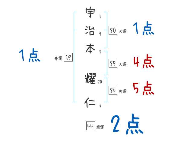 総運![]() | 宇治本耀仁さんの総運は44画の2つ星!誠実で慎重な性格。物事を考えすぎないように注意しましょう。 あなたの人生を表す1番重要な運勢です。生涯を通じて影響する総合運となり、主に50歳以降の晩年期に影響を及ぼします。 |