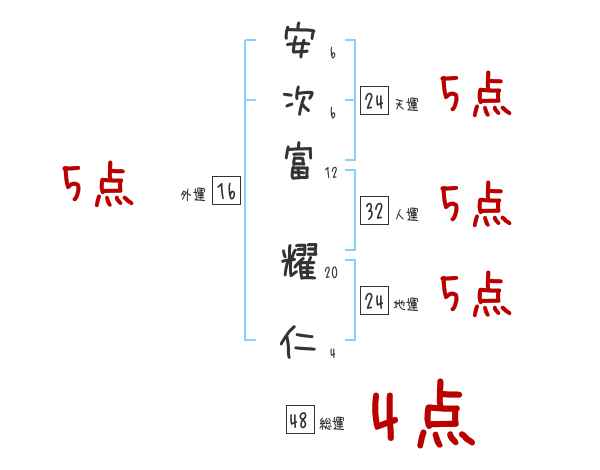 天運![]() | 安次富耀仁さんの天運は24画の5つ星!家庭運が良く順調な人生。金運にも恵まれる。 家系が持つ宿命的な運勢を表します。祖先から受け継いだ苗字ですので自分の力が及びません。家柄を象徴します。 |