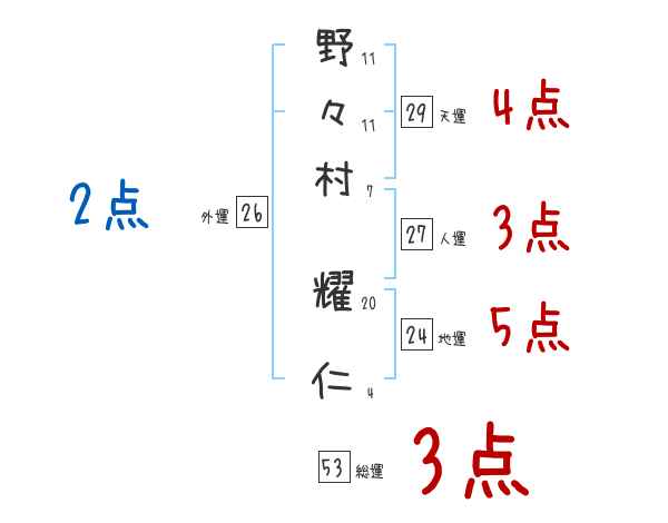 天運![]() | 野々村耀仁さんの天運は29画の4つ星!完全主義で才能がある。厳格な心の持ち主。 家系が持つ宿命的な運勢を表します。祖先から受け継いだ苗字ですので自分の力が及びません。家柄を象徴します。 |