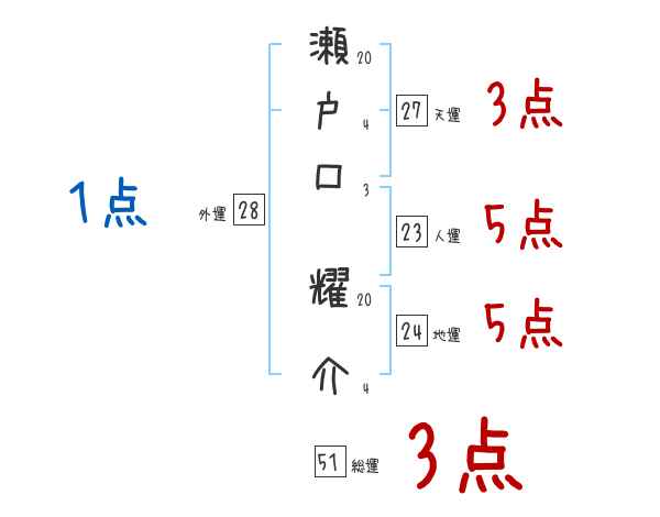 外運![]() | 瀬戸口耀介さんの外運は28画の1つ星!家庭環境に注意。スポーツで活躍できる能力があるかも。 生活面を象徴する運勢です。外部から受ける影響力を表し、結婚運、家庭運や職場、環境への順応性を表します。 |