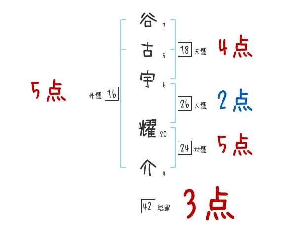 天運![]() | 谷古宇耀介さんの天運は18画の4つ星!情熱的で剛気。忍耐力があり信頼される。 家系が持つ宿命的な運勢を表します。祖先から受け継いだ苗字ですので自分の力が及びません。家柄を象徴します。 |