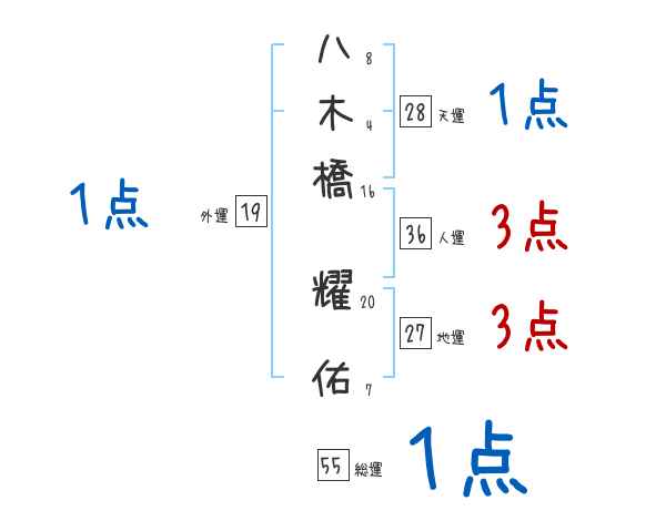 天運![]() | 八木橋耀佑さんの天運は28画の1つ星!家庭環境に注意。スポーツで活躍できる能力があるかも。 家系が持つ宿命的な運勢を表します。祖先から受け継いだ苗字ですので自分の力が及びません。家柄を象徴します。 |