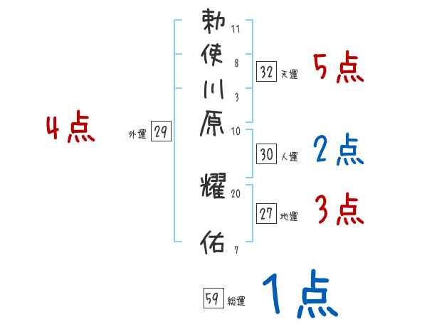 天運![]() | 勅使川原耀佑さんの天運は32画の5つ星!柔軟性があり成功する。チャンスが多く金運が良い。 家系が持つ宿命的な運勢を表します。祖先から受け継いだ苗字ですので自分の力が及びません。家柄を象徴します。 |