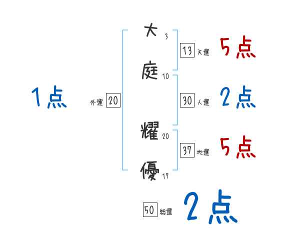 天運![]() | 大庭耀優さんの天運は13画の5つ星!才能に恵まれ人気がある。名声を手に入れる。円満な人生。 家系が持つ宿命的な運勢を表します。祖先から受け継いだ苗字ですので自分の力が及びません。家柄を象徴します。 |