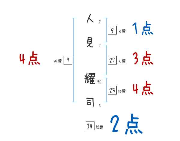 総運![]() | 人見耀司さんの総運は34画の2つ星!独創性に優れるが、自尊心が強く災難に注意しましょう。 あなたの人生を表す1番重要な運勢です。生涯を通じて影響する総合運となり、主に50歳以降の晩年期に影響を及ぼします。 |
