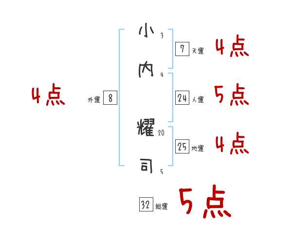 総運![]() | 小内耀司さんの総運は32画の5つ星!柔軟性があり成功する。チャンスが多く金運が良い。 あなたの人生を表す1番重要な運勢です。生涯を通じて影響する総合運となり、主に50歳以降の晩年期に影響を及ぼします。 |