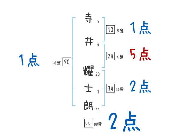天運![]() | 寺井耀士朗さんの天運は10画の1つ星!不安を感じやすい傾向。ストレスを抱えないように注意しましょう。 家系が持つ宿命的な運勢を表します。祖先から受け継いだ苗字ですので自分の力が及びません。家柄を象徴します。 |