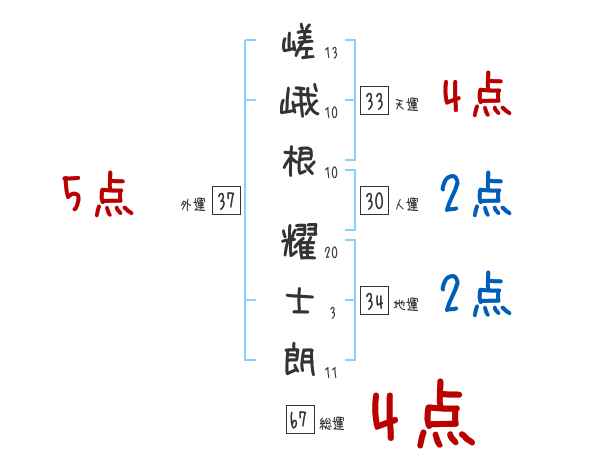 外運![]() | 嵯峨根耀士朗さんの外運は37画の5つ星!努力家で順応性に優れる。現実的な考え方ができ忠実に物事をこなす。 生活面を象徴する運勢です。外部から受ける影響力を表し、結婚運、家庭運や職場、環境への順応性を表します。 |