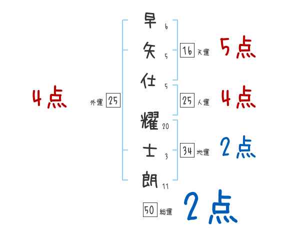 外運![]() | 早矢仕耀士朗さんの外運は25画の4つ星!個性があり才能があふれる。強運の持ち主で発展する。 生活面を象徴する運勢です。外部から受ける影響力を表し、結婚運、家庭運や職場、環境への順応性を表します。 |